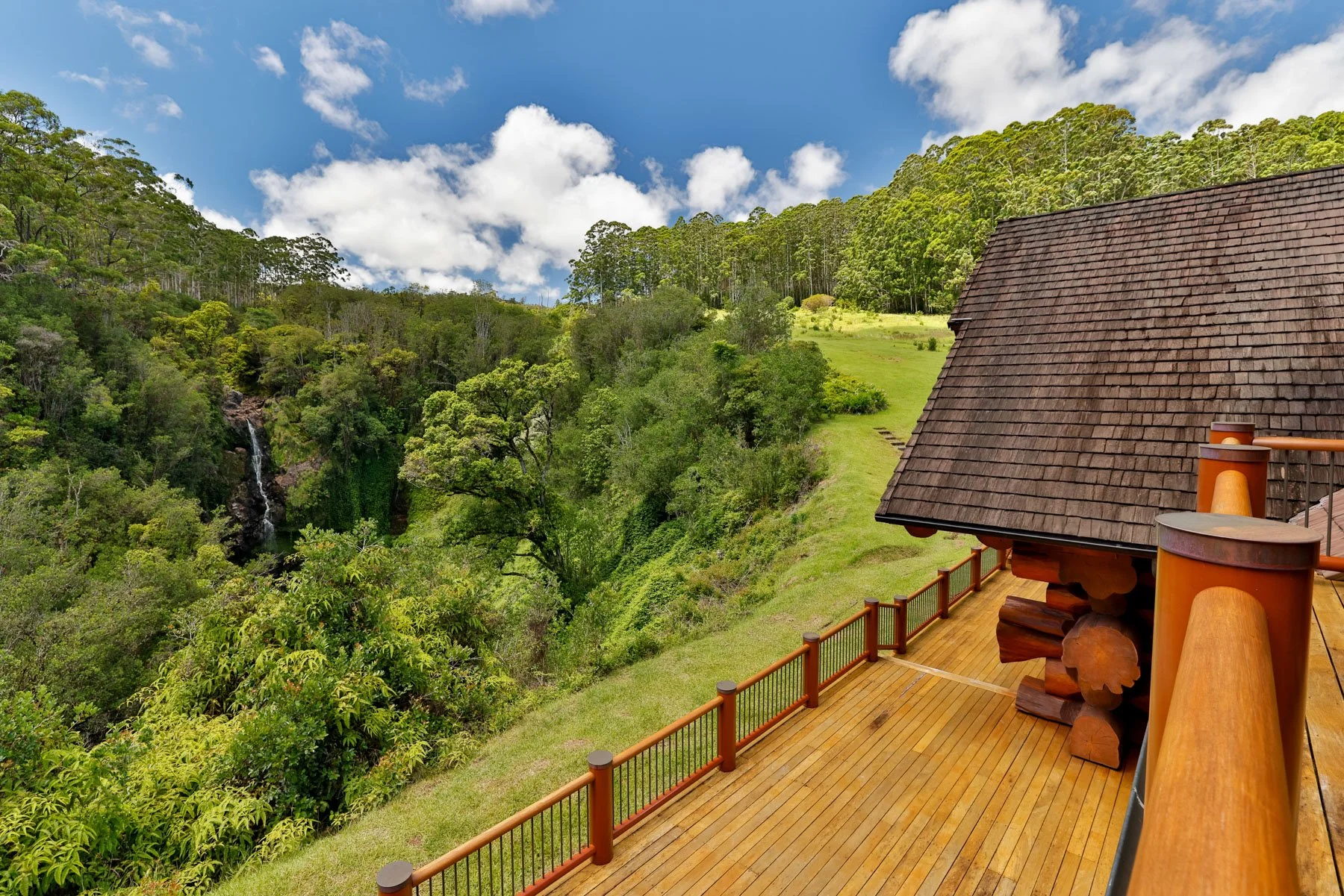 At the heart of Kupaianaha Ranch is a custom-built timber frame mansion that blends rustic sophistication with its tropical surroundings. The residence offers panoramic views of cascading waterfalls and the vast ocean, balancing luxury with the natural landscape. The first floor features a living room, den, dining room, kitchen, and guest bedroom, all opening to a wraparound deck with waterfall views. Upstairs, the primary bedroom, two guest rooms, and a multipurpose room connect via a winding staircase to a turret with stunning views.